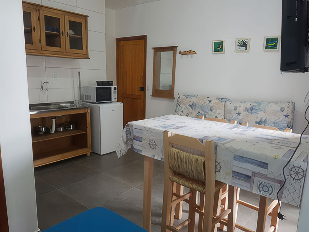 - Mini cozinha com fogão elétrico, micro-ondas, cafeteira e geladeira