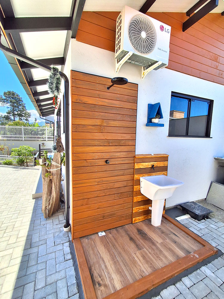 - Área de serviço (com ducha externa, churrasqueira, espetos, grelha e tanque)