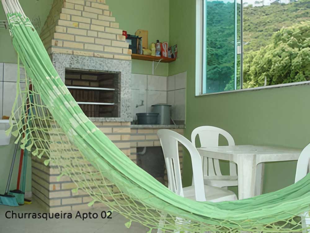 - Sacada (com churrasqueira, pia, espetos e grelhas, mesa e cadeiras de plástico, e rede de descanso)