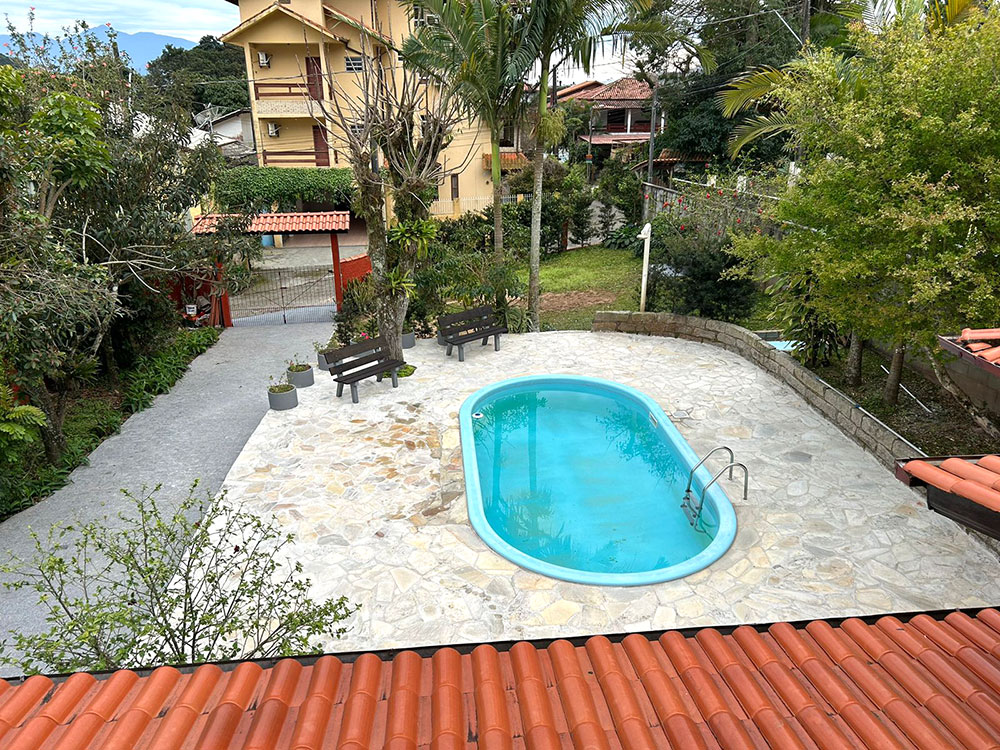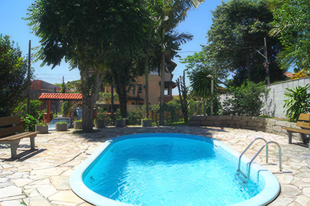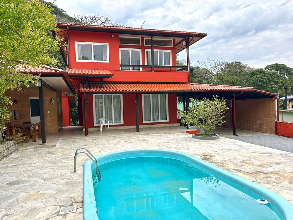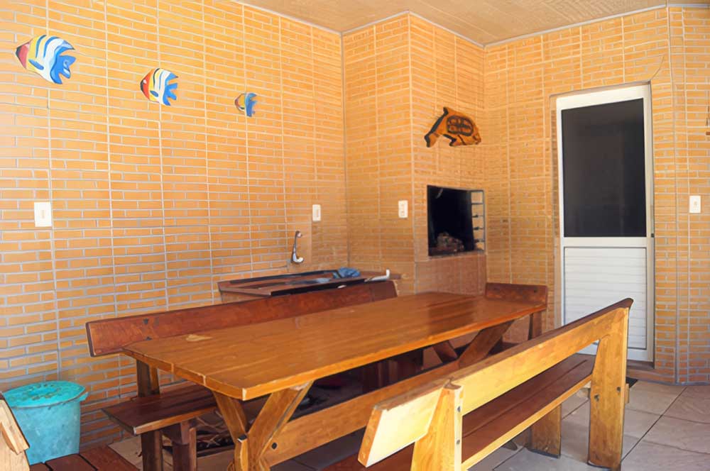 Ampla residência localizada na Praia de Cima da Pinheira, aproximadamente 300 metros da praia, em pátio arborizado, gramado, murado e fechado. A casa conta com:
