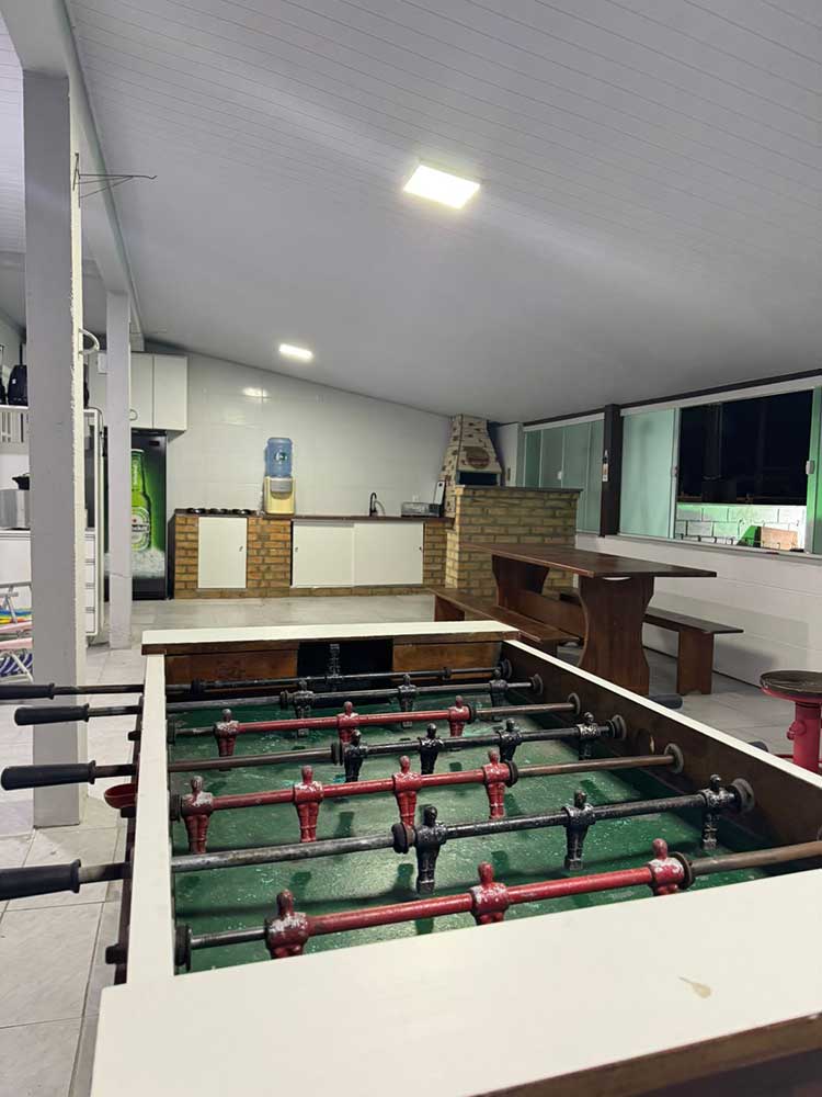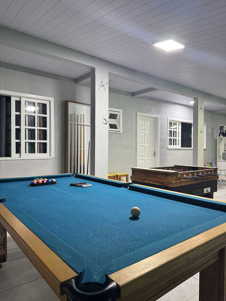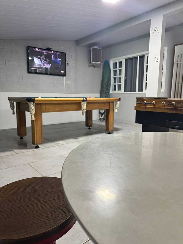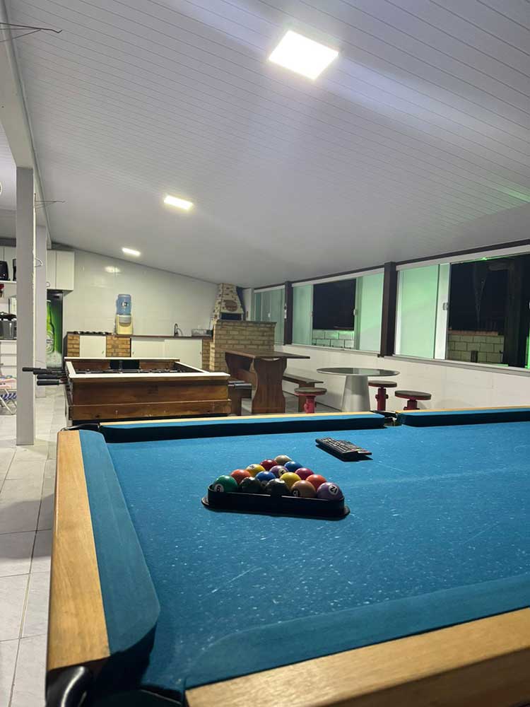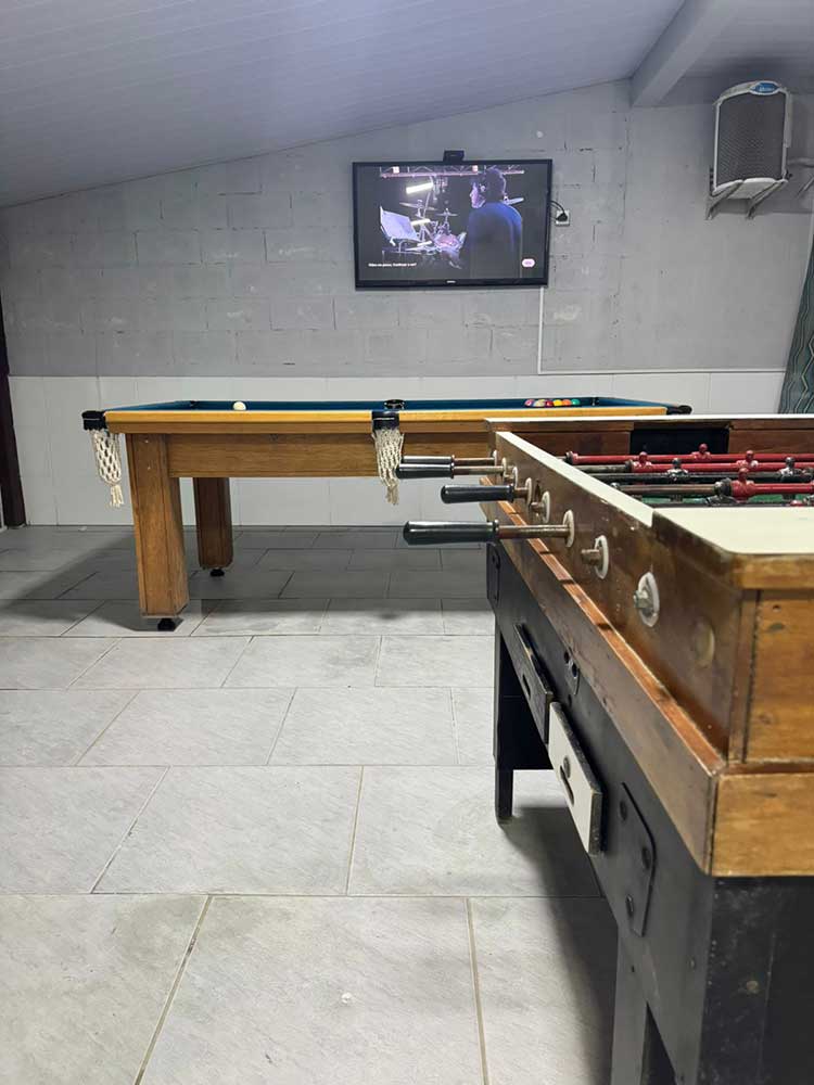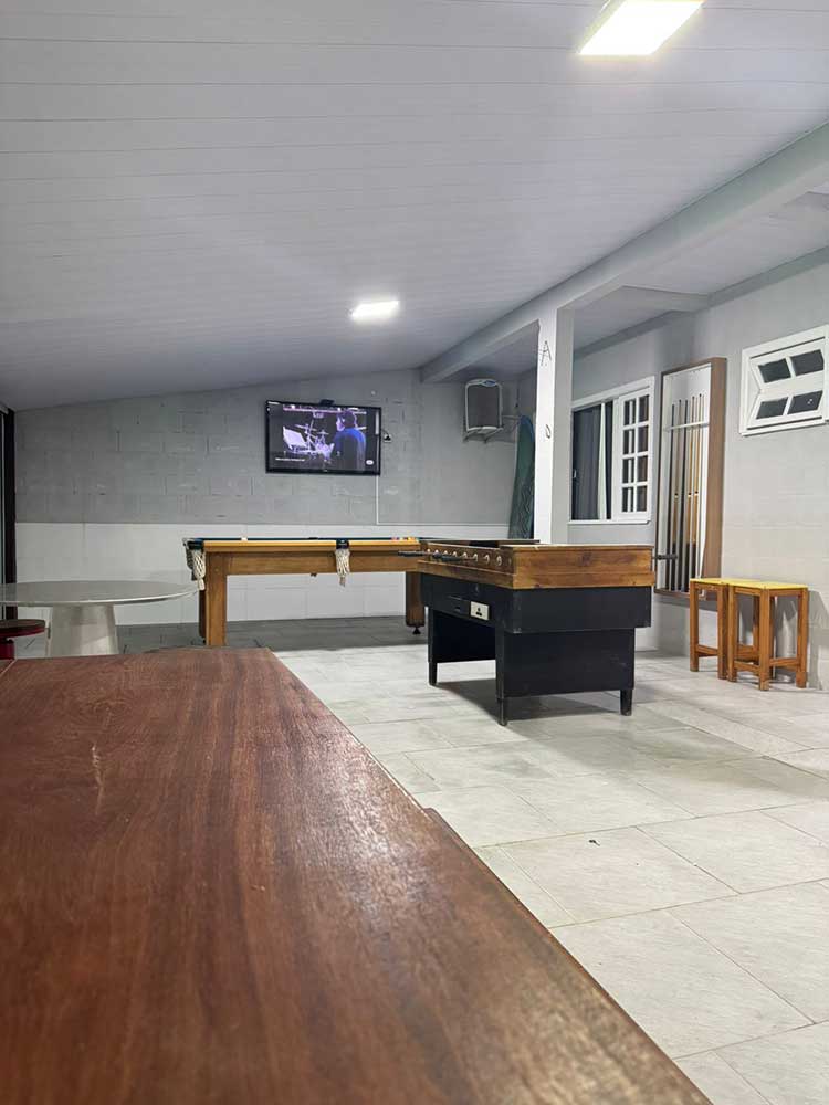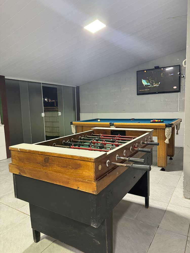 - Mesa de sinuca, pebolim, cervejeira, churrasqueira, air fryer, liquidificador, micro-ondas, cafeteira, fogão, geladeira, mesa para churrasco e TV