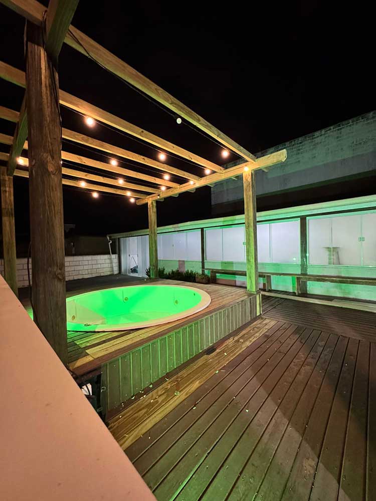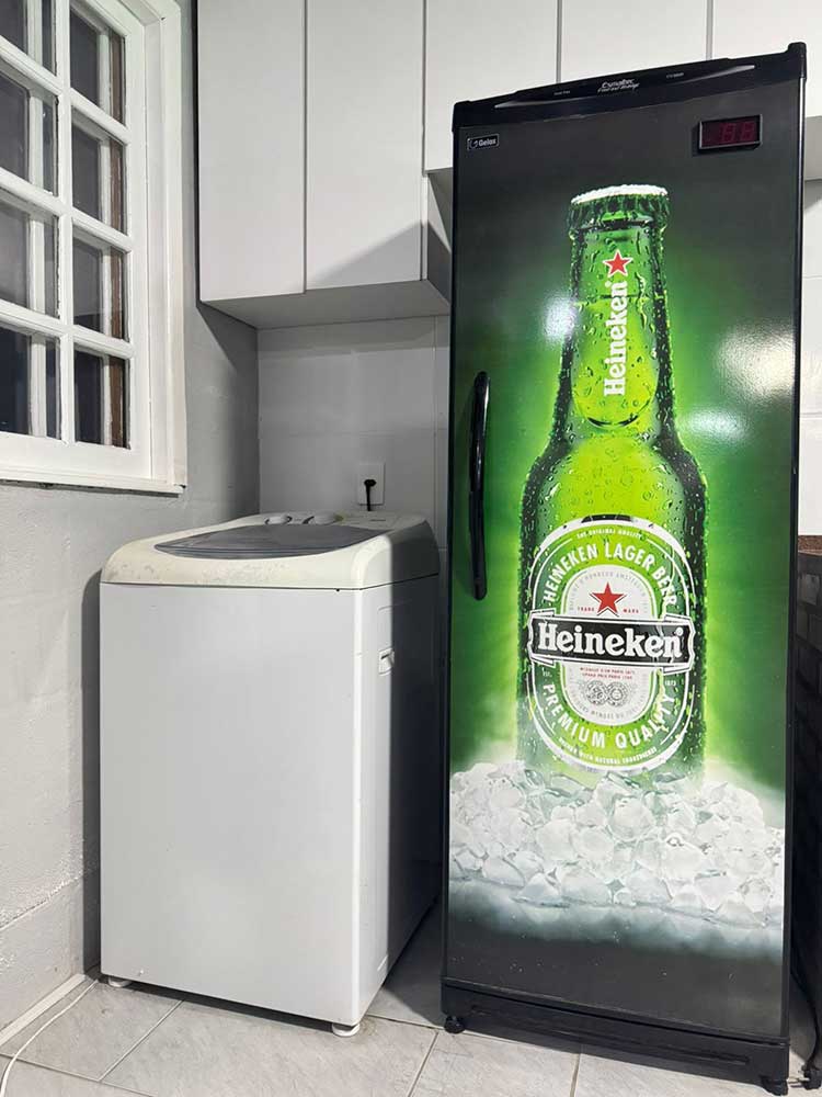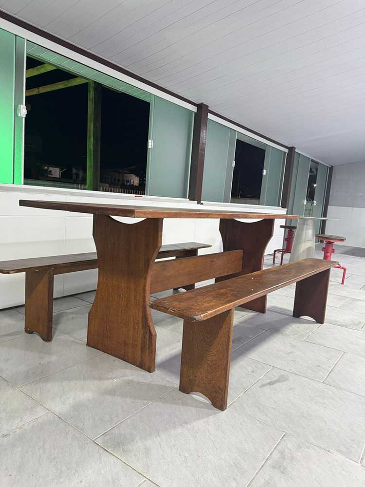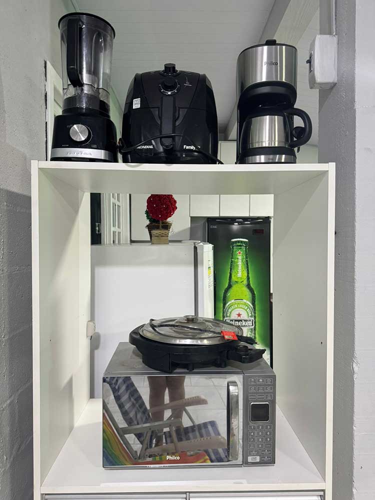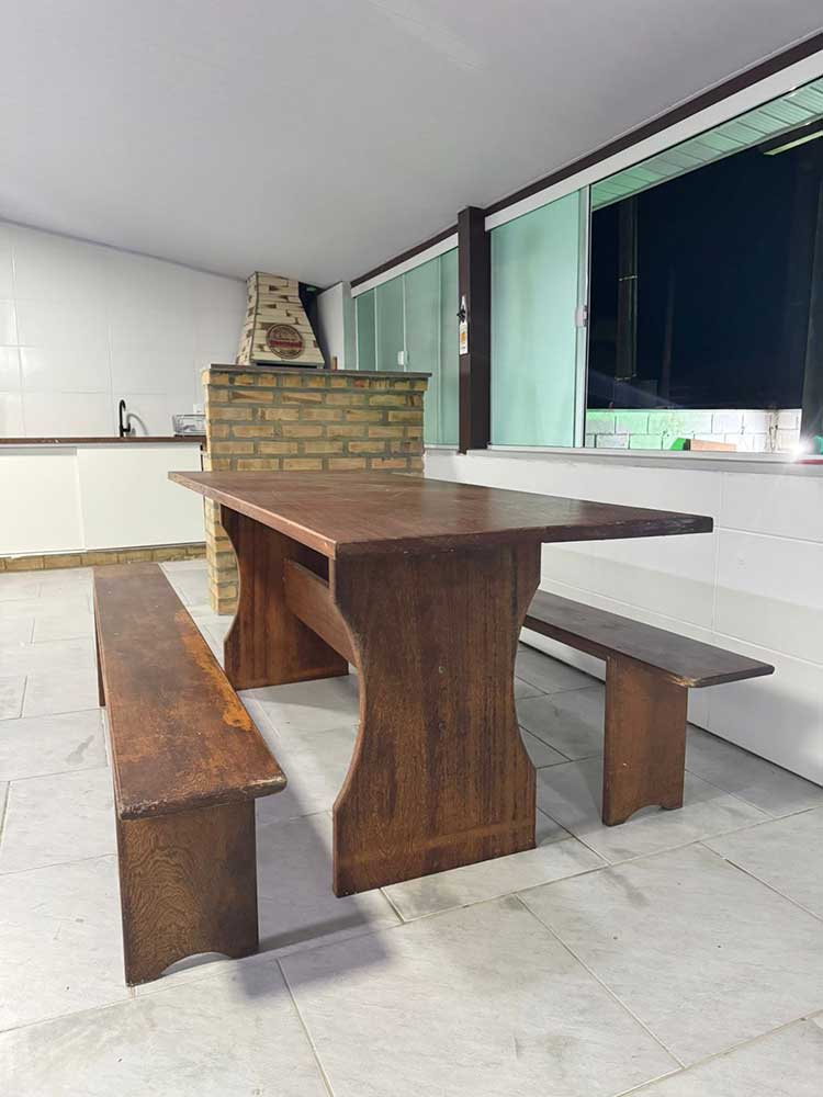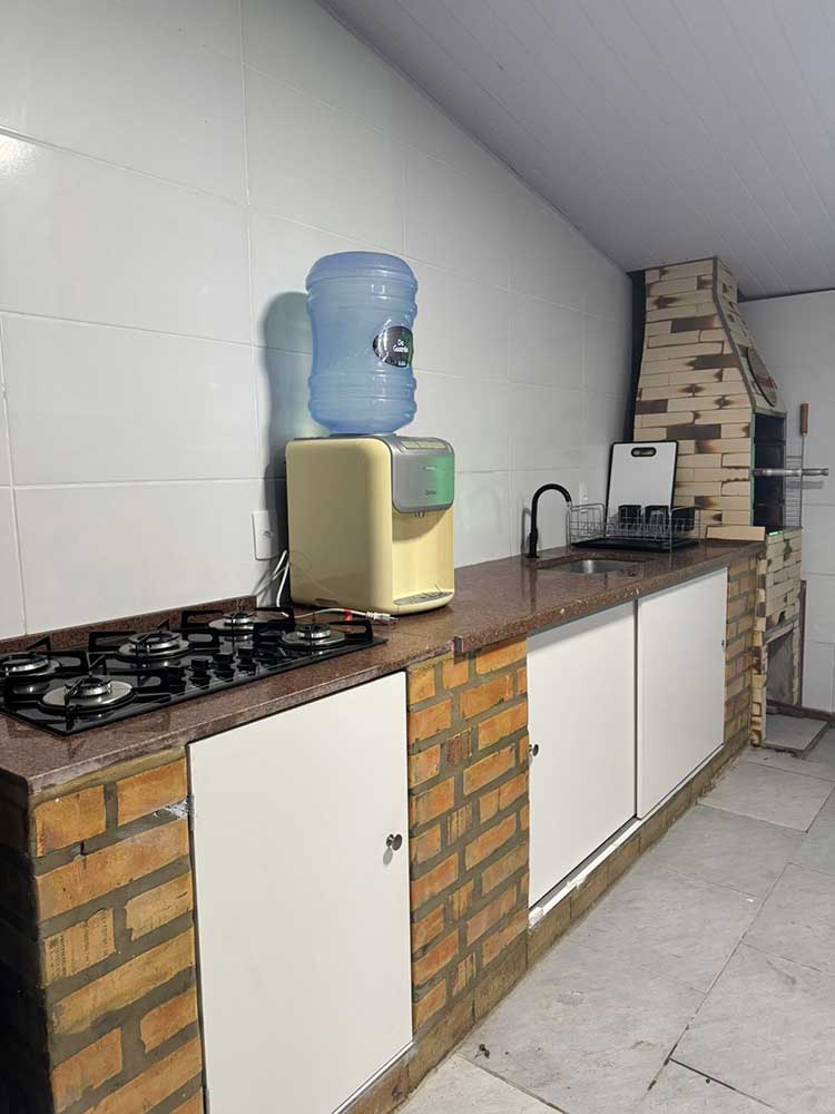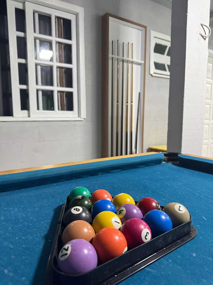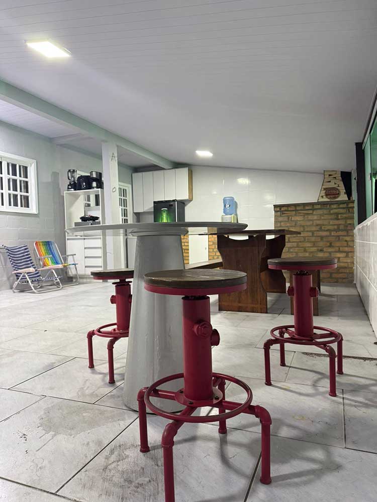 - Mesa de sinuca, pebolim, cervejeira, churrasqueira, air fryer, liquidificador, micro-ondas, cafeteira, fogão, geladeira, mesa para churrasco e TV