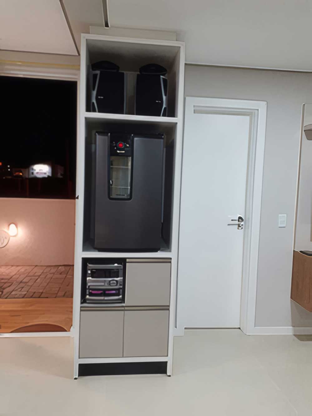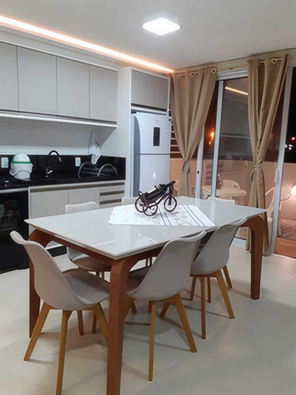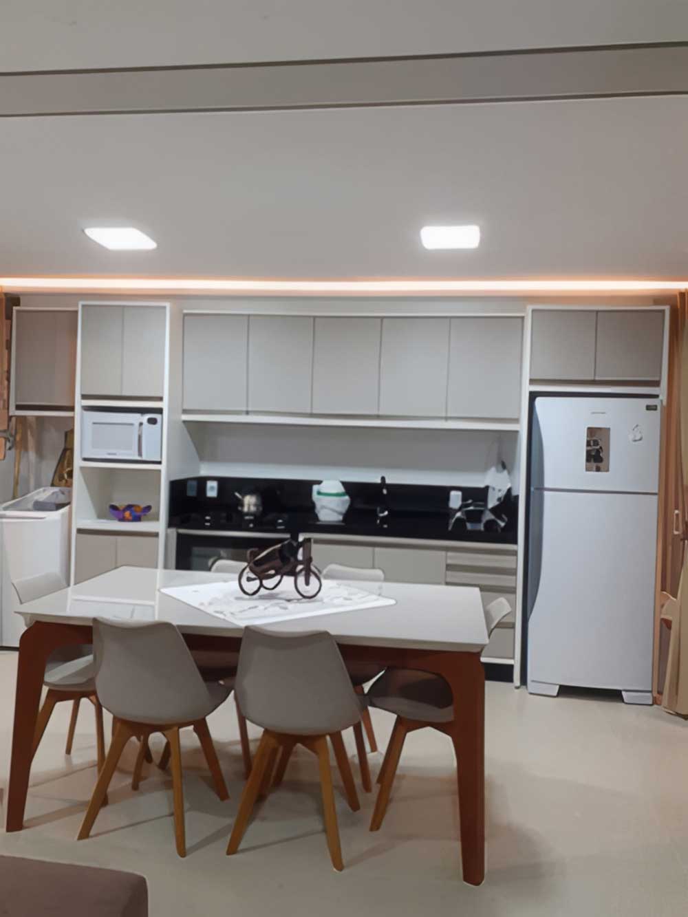- Cozinha equipada (com mesa e cadeiras para 06 pessoas, geladeira duplex, micro-ondas, fogão 5 bocas, máquina de lavar-roupa, varal de chão, ferro elétrico, sanduicheira, batedeira, liquidificador, chaleira elétrica, bebedouro elétrico, cafeteira e air fryer)