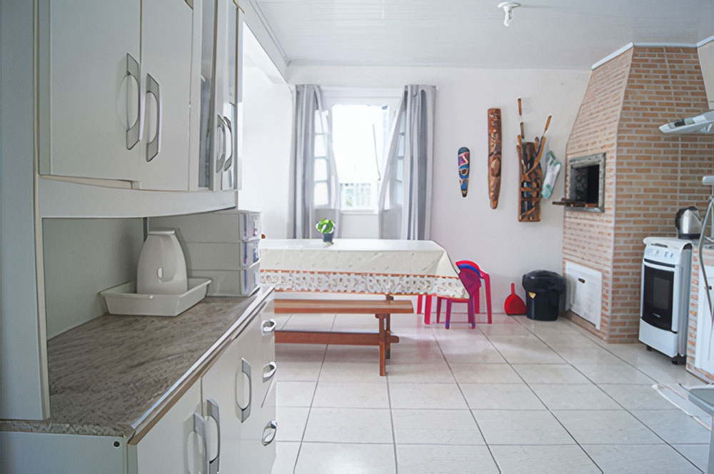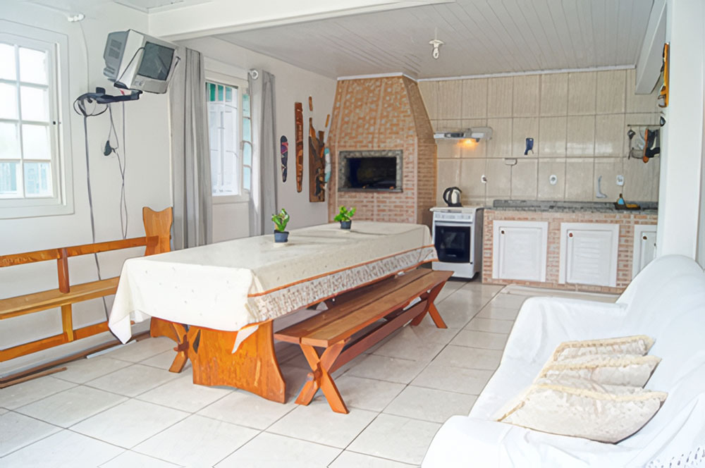 - Cozinha completa (com geladeira duplex, freezer, micro-ondas, forno elétrico, máquina de lavar roupas, churrasqueira, espetos, grelha e 02 mesas para churrasco)